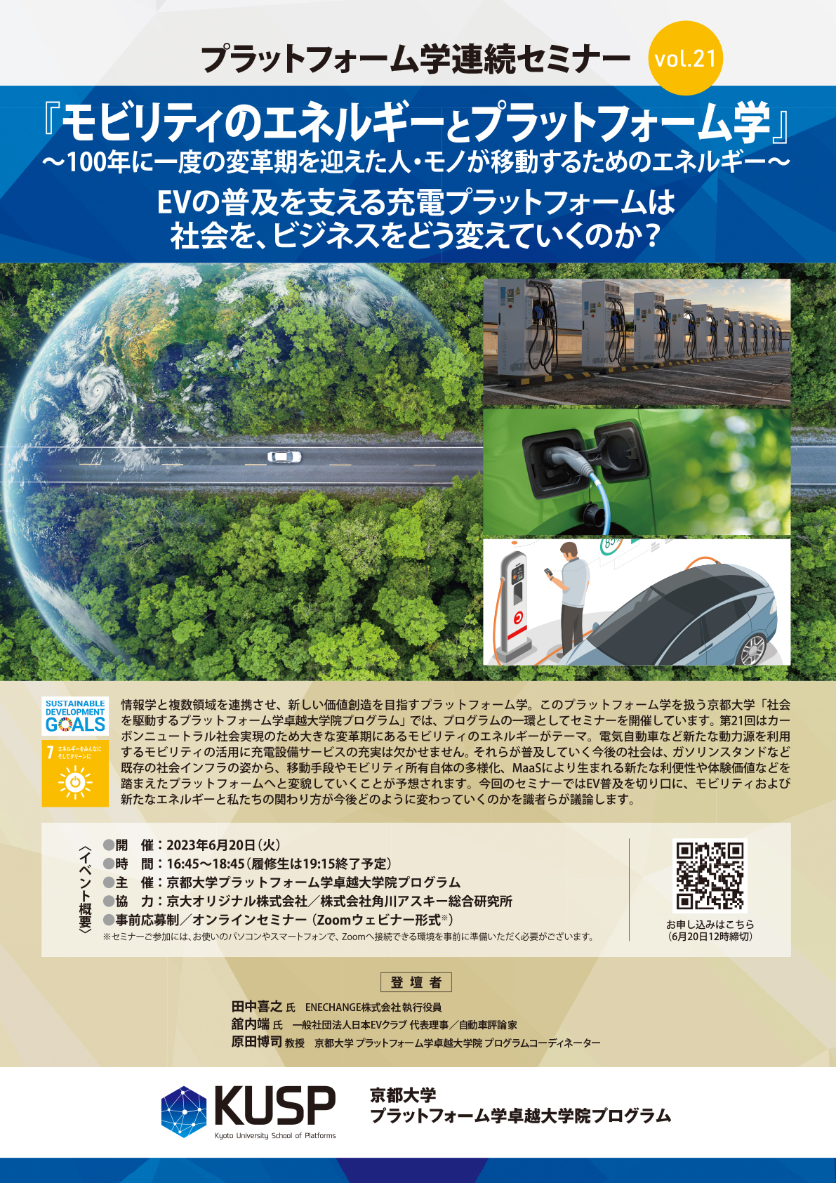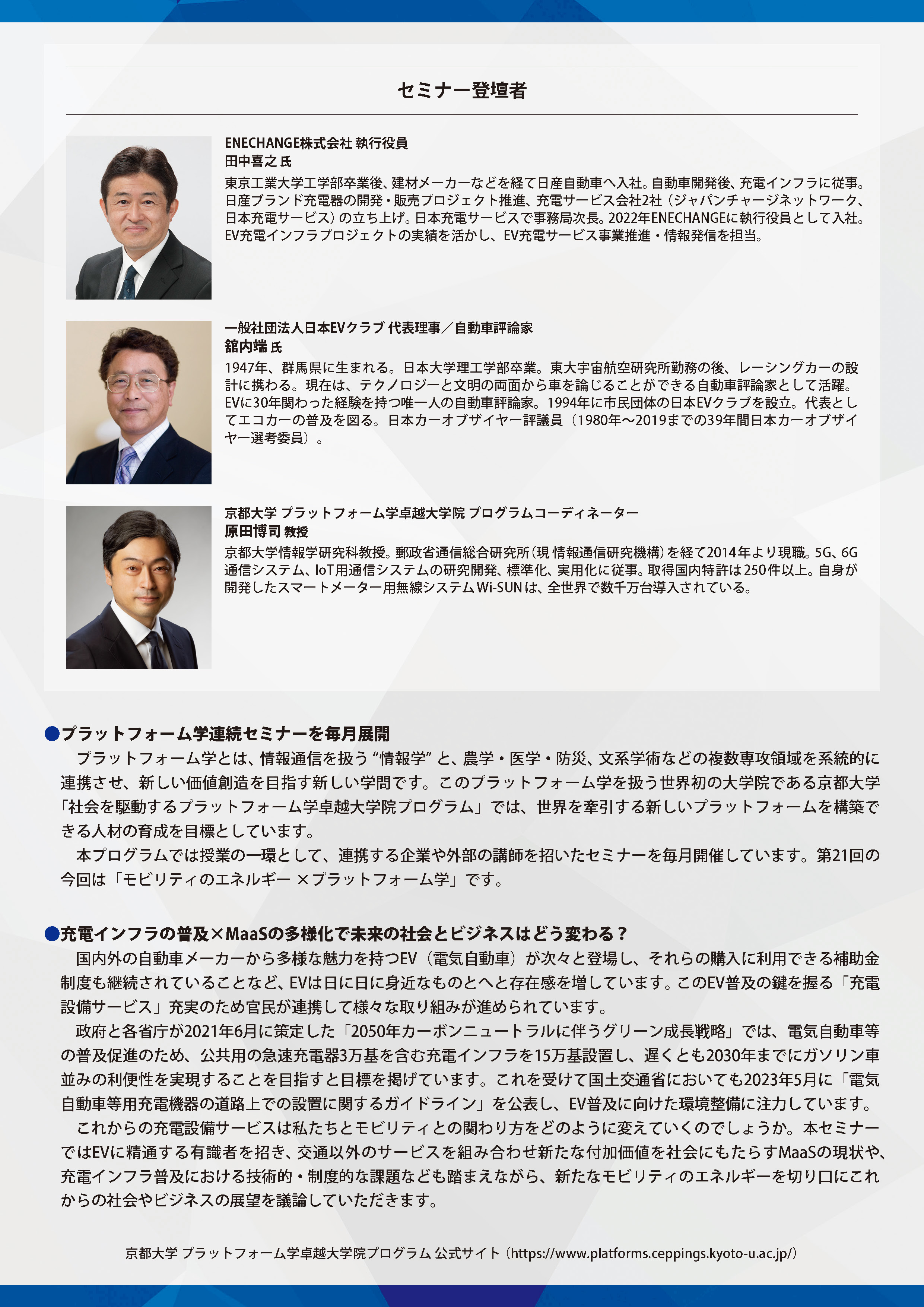 情報学と複数領域を連携させ、新しい価値創造を目指すプラットフォーム学。このプラットフォーム学を扱う京都大学「社会を駆動するプラットフォーム学卓越大学院プログラム」では、プログラムの一環としてセミナーを開催しています。第21回はカーボンニュートラル社会実現のため大きな変革期にあるモビリティのエネルギーがテーマ。電気自動車など新たな動力源を利用するモビリティの活用に充電設備サービスの充実は欠かせません。それらが普及していく今後の社会は、ガソリンスタンドなど既存の社会インフラの姿から、移動手段やモビリティ所有自体の多様化、MaaSにより生まれる新たな利便性や体験価値などを踏まえたプラットフォームへと変貌していくことが予想されます。今回のセミナーではEV普及を切り口に、モビリティおよび新たなエネルギーと私たちの関わり方が今後どのように変わっていくのかを識者らが議論します。