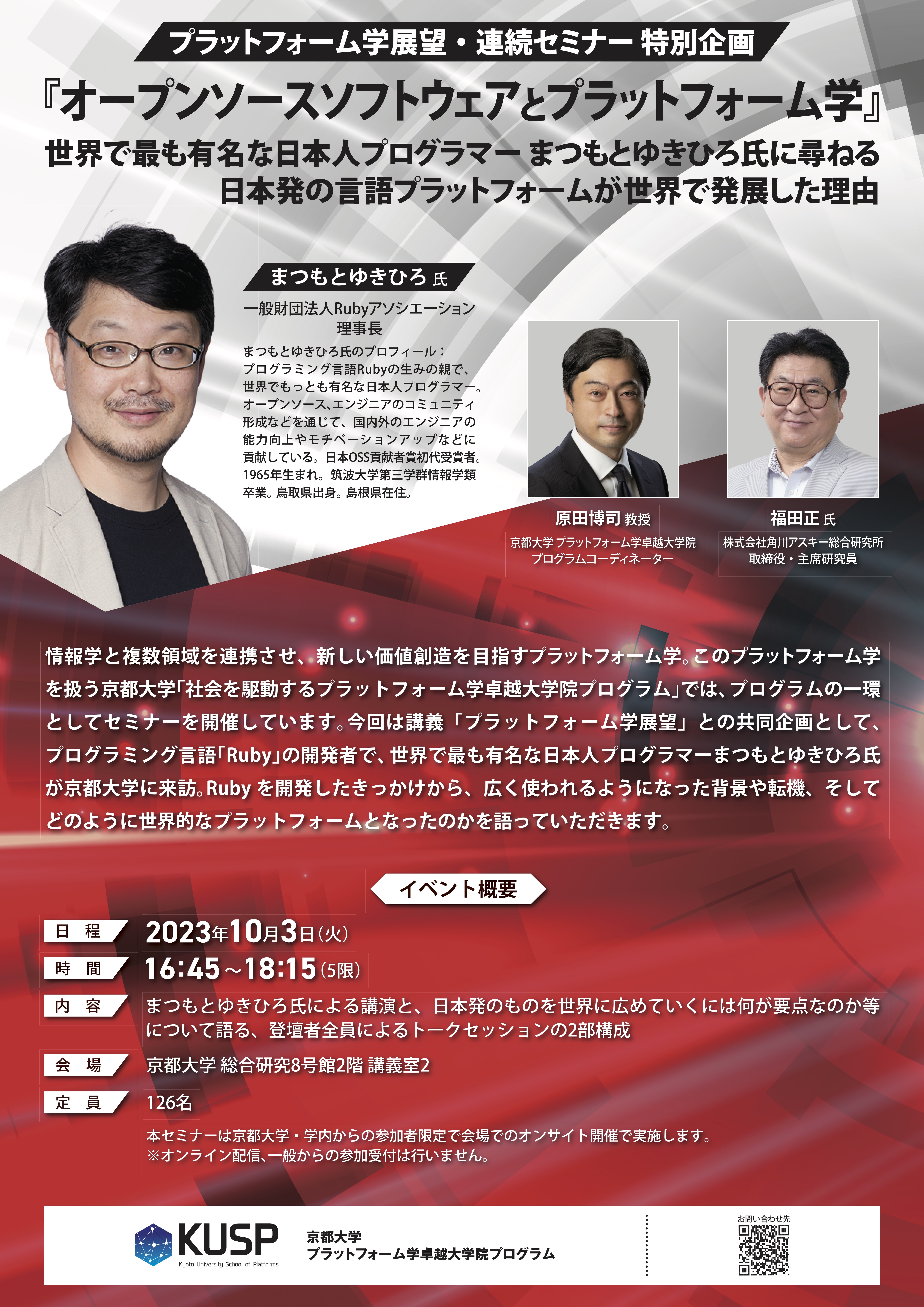 情報学と複数領域を連携させ、新しい価値創造を目指すプラットフォーム学。このプラットフォーム学を扱う京都大学「社会を駆動するプラットフォーム学卓越大学院プログラム」では、プログラムの一環としてセミナーを開催しています。今回は講義「プラットフォーム学展望」との共同企画として、プログラミング言語「Ruby」の開発者で、世界で最も有名な日本人プログラマーまつもとゆきひろ氏が京都大学に来訪。Rubyを開発したきっかけから、広く使われるようになった背景や転機、そしてどのように世界的なプラットフォームとなったのかを語っていただきます。