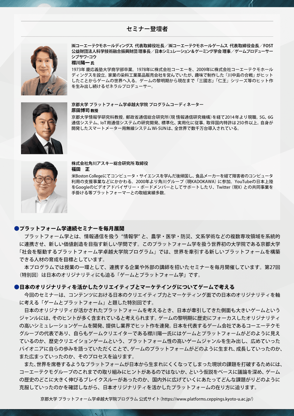 情報学と複数領域を連携させ、新しい価値創造を目指すプラットフォーム学。このプラットフォーム学を扱う京都大学「社会を駆動するプラットフォーム学卓越大学院プログラム」では、プログラムの一環としてセミナーを開催しています。今回は特別編として、ゲームとプラットフォームについて取り上げます。今回は、日本を代表するゲーム会社であるコーエーテクモグループの代表であり、自らもゲームクリエイターである襟川陽一氏に登壇いただき、ゲームというジャンルのプラットフォームについて考えます。歴史シミュレーション、または歴史クリエイションというゲームジャンルを確立し、日本のオリジナリティを追求したコンテンツクリエイション、また、そのコンテンツを普及させるためのマーケティング戦略、そして海外進出施策におけるオリジナリティについて、お話を伺いながら、日本のゲーム業界とプラットフォームがどのように変化してきたのか、これからどのような方向に進むのか、日本の独自性についても議論します。