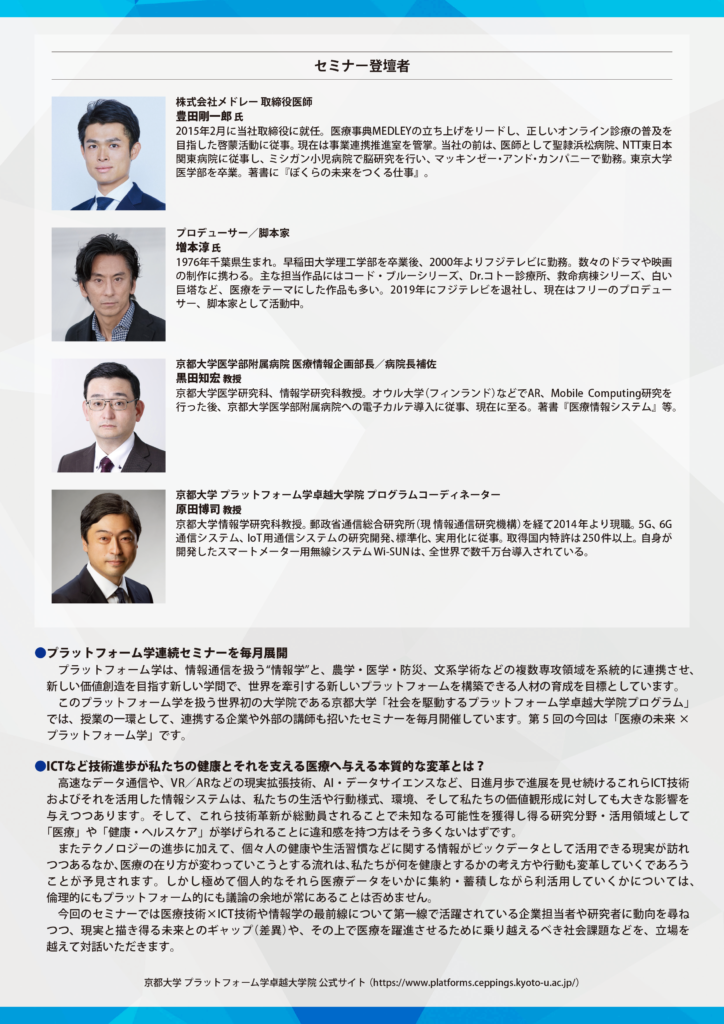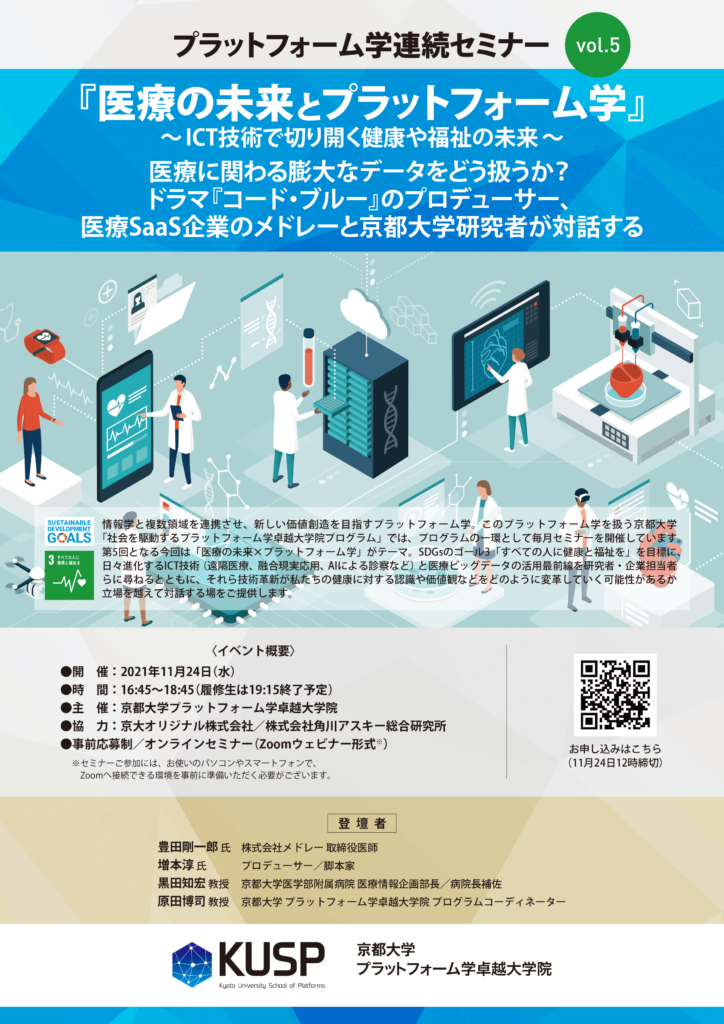 第5回となる今回は「医療の未来×プラットフォーム学」がテーマ。SDGsのゴール3「すべての人に健康と福祉を」を目標に、日々進化するICT技術(遠隔医療、融合現実応用、AIによる診察など)と医療ビッグデータの活用最前線を研究者・企業担当者らに尋ねるとともに、それら技術革新が私たちの健康に対する認識や価値観などをどのように変革していく可能性があるか立場を越えて対話する場をご提供します。