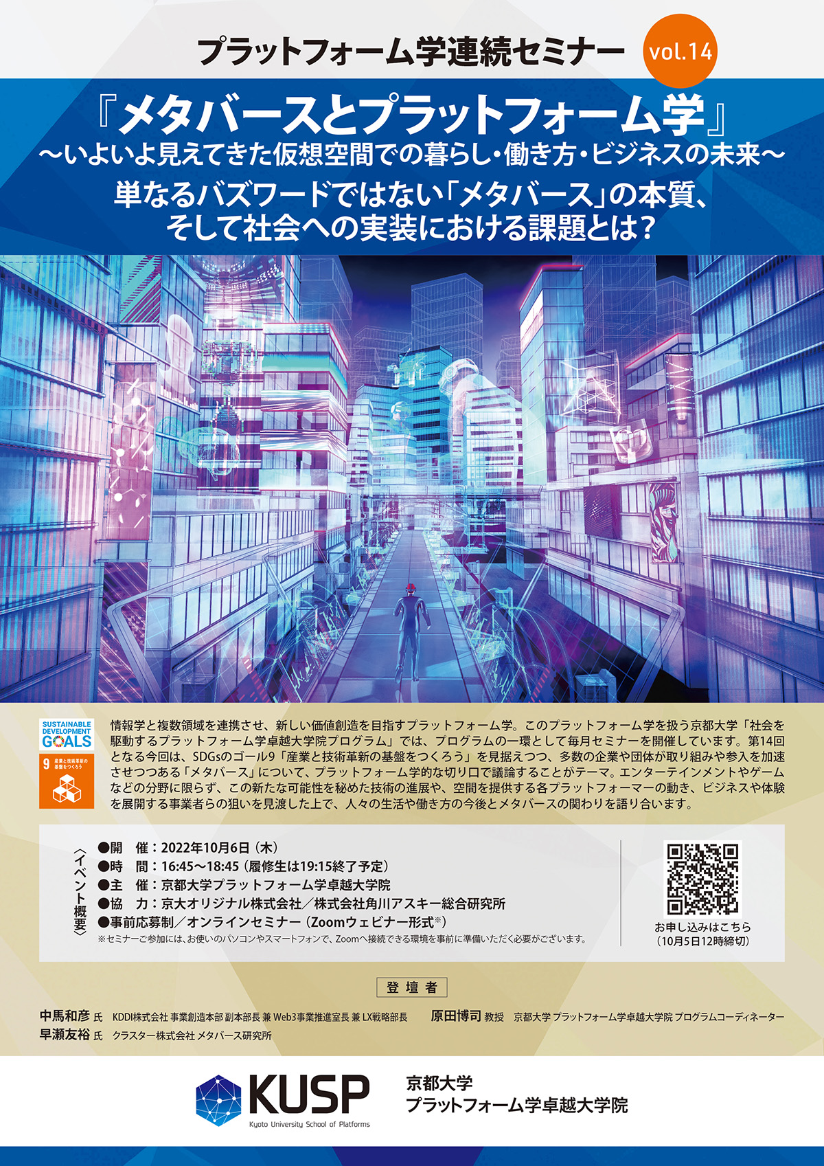 第14回となる今回は、SDGsのゴール9「産業と技術革新の基盤をつくろう」を見据えつつ、多数の企業や団体が取り組みや参入を加速させつつある「メタバース」について、プラットフォーム学的な切り口で議論することがテーマ。