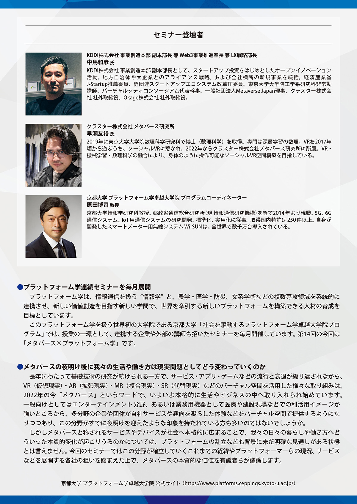 情報学と複数領域を連携させ、新しい価値創造を目指すプラットフォーム学。このプラットフォーム学を扱う京都大学「社会を駆動するプラットフォーム学卓越大学院プログラム」では、プログラムの一環として毎月セミナーを開催しています。