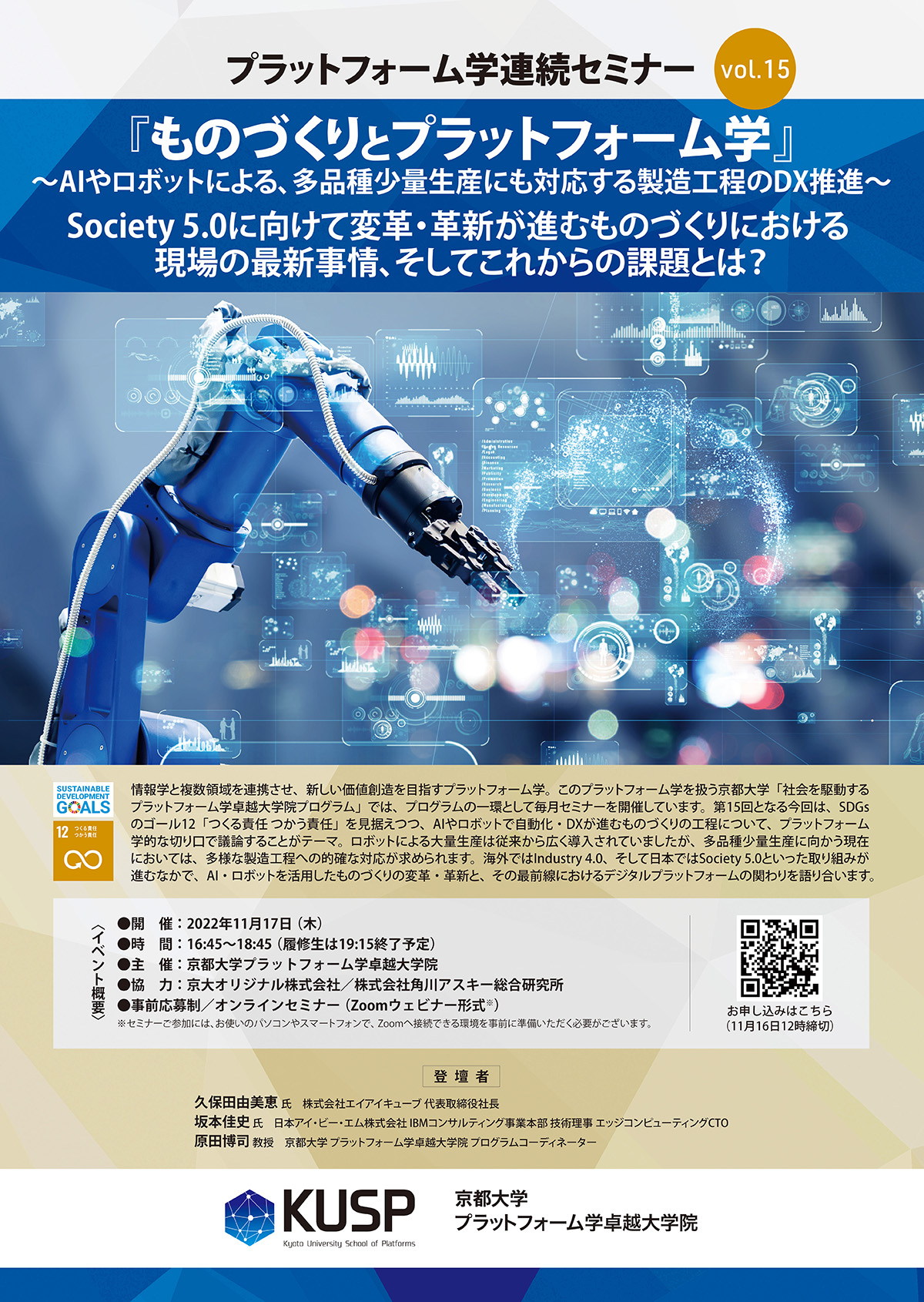 第15回となる今回は、SDGsのゴール12「つくる責任 つかう責任」を見据えつつ、AIやロボットで自動化・DXが進むものづくりの工程について、プラットフォーム学的な切り口で議論することがテーマ。