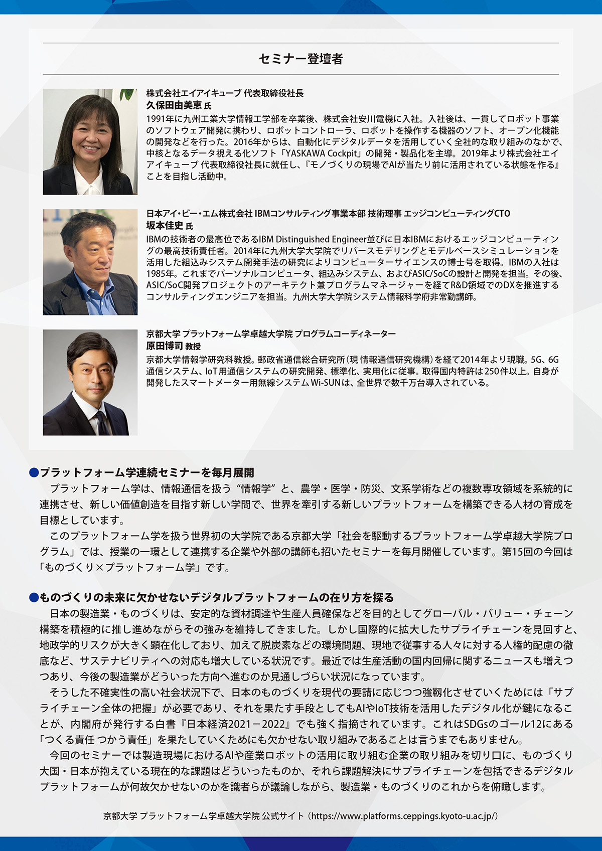 情報学と複数領域を連携させ、新しい価値創造を目指すプラットフォーム学。このプラットフォーム学を扱う京都大学「社会を駆動するプラットフォーム学卓越大学院プログラム」では、プログラムの一環として毎月セミナーを開催しています。